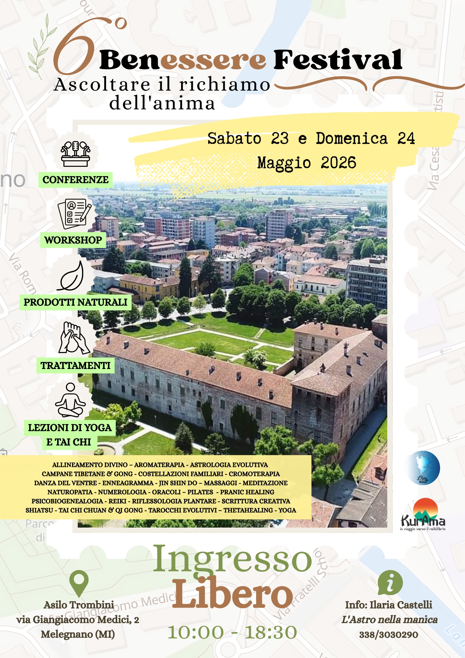 Dopo il successo delle passate edizioni, sono felicissima di invitarvi a partecipare alla sesta edizione del Benessere Festival che anche quest’anno si terrà presso i giardini e all’interno della Palazzina Trombini di fronte al Castello di Melegnano. La novità di quest’anno è che il Festival si terrà in due giornate quindi avrete ancora più tempo da dedicare a voi stessi